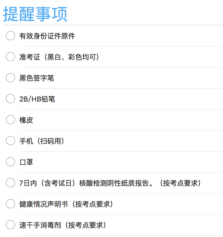 另外按照各考点要求,也会要求考生在考试当天提供7日内(含考试日)核酸检测阴性纸质报告,并且签署《个人健康情况声明》,请大家确认自己考点的进校要求准备材料。