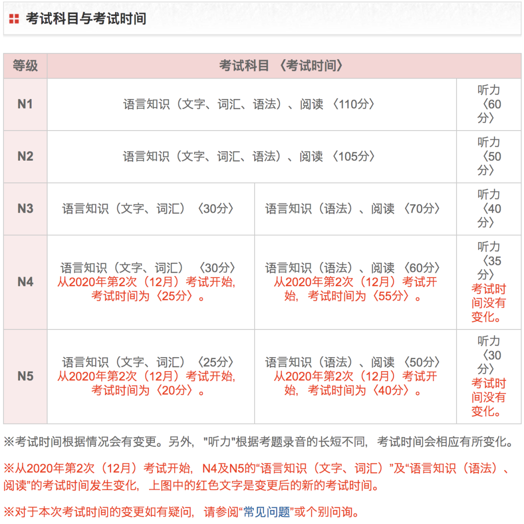 从2020年第2次(12月)考试开始,N4及N5的“语言知识(文字、词汇)”及“语言知识(语法)、阅读”的考试时间发生变化,大家在复习的时候一定要合理安排答卷时间!