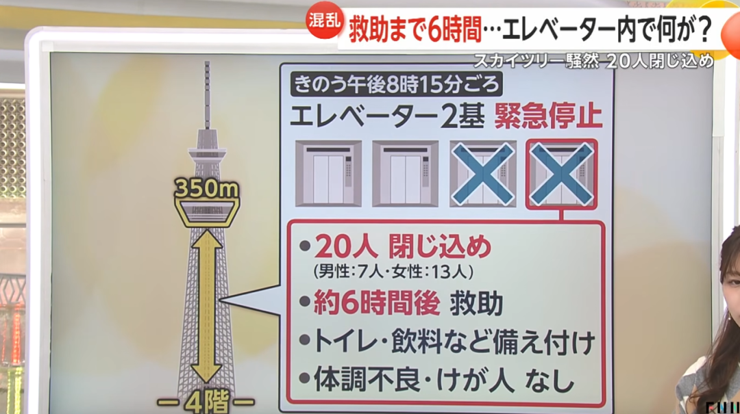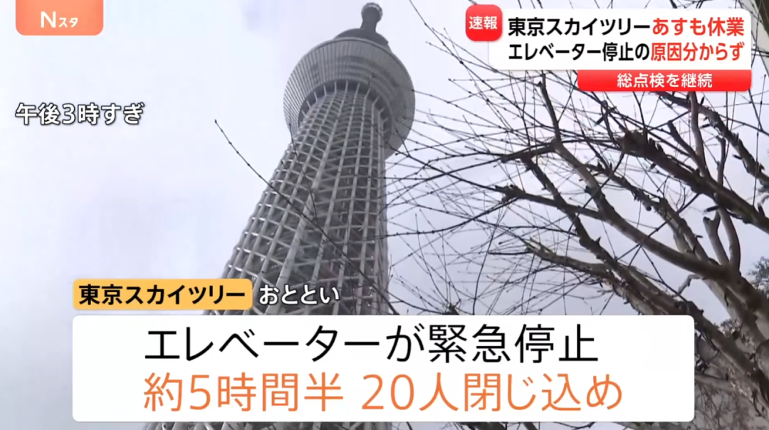 2月22日晚上8点15分,这座作为东京地标、有着634米高的东京晴空塔里,连接地面和350米观景台的4部电梯中的“秋”号和“冬”号突然伴着警报声停摆。