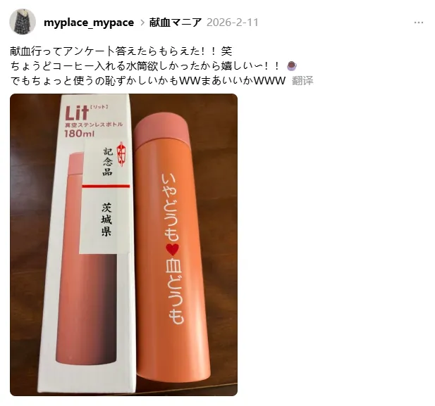 “诶!我明天要去献血。我也在茨城县,不知道能不能领到这个呢。”